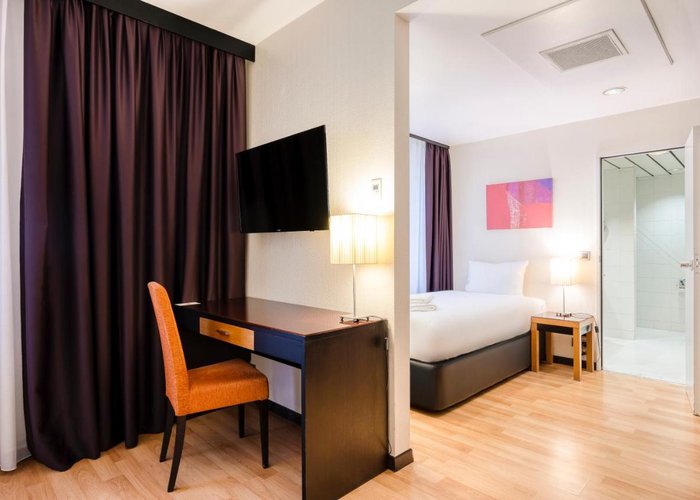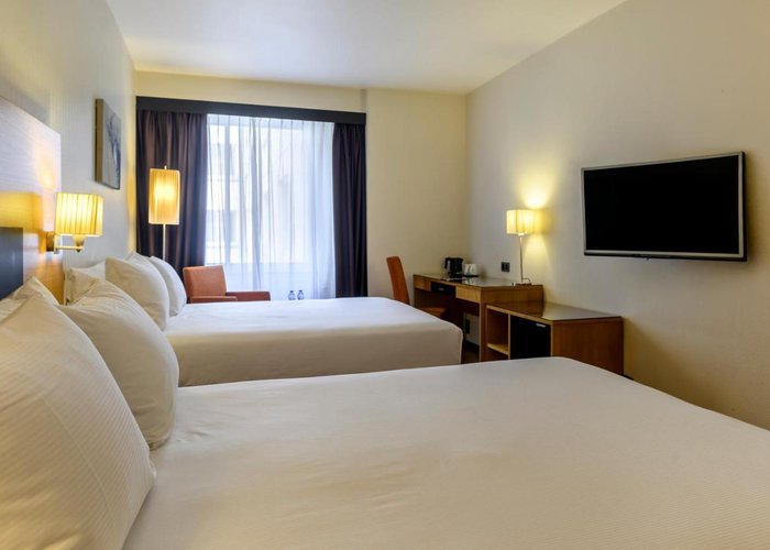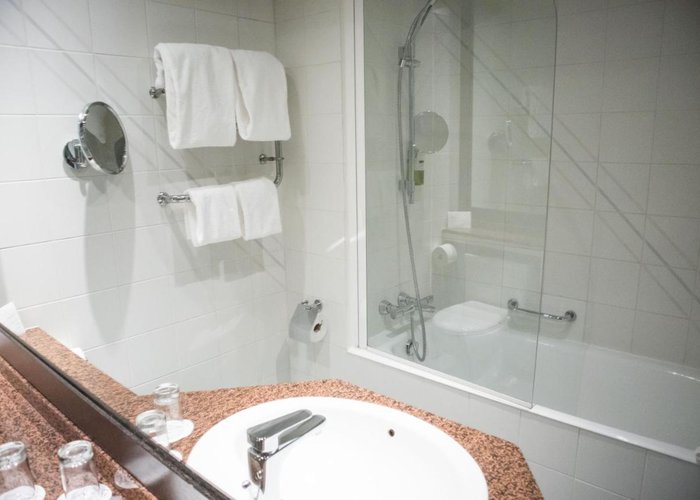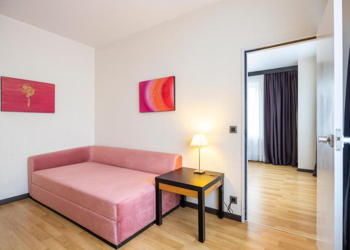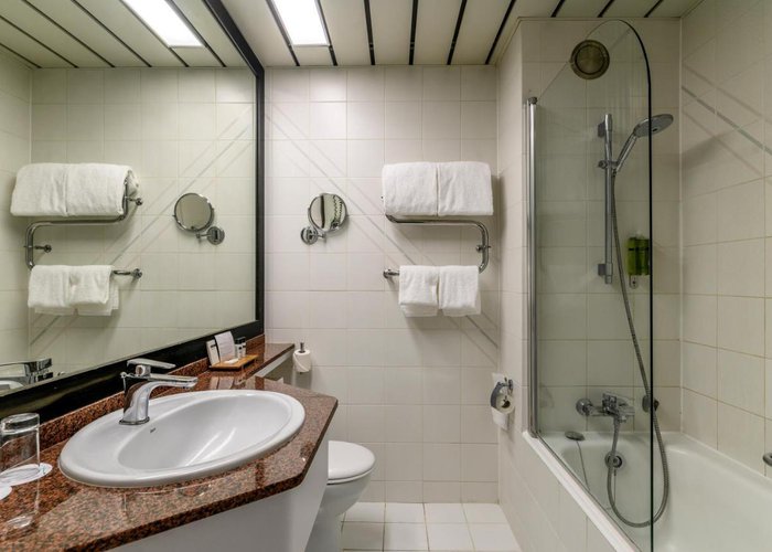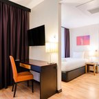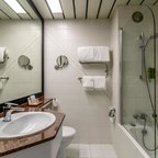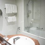 Rooms include air conditioning and central heating. The rooms have a queen-size bed and a sofa bed. Extra beds can be requested. A safe, a minibar and a desk are also available. Additional features include a refrigerator and a tea/coffee station. Other amenities available include an ironing set and a trouser press. A direct dial telephone, a television with satellite/cable channels, a radio and WiFi (no extra charge) are provided as well. A turndown service offers guests additional comfort. Slippers are included. Bathrooms are equipped with a shower and a bathtub. A hairdryer, a vanity mirror and a telephone are available for daily use. As a special feature, bathrooms are also stocked with cosmetic products and a selection of towels. Wheelchair-friendly rooms can be booked. The hotel has family rooms, non-smoking rooms and smoking rooms.