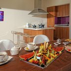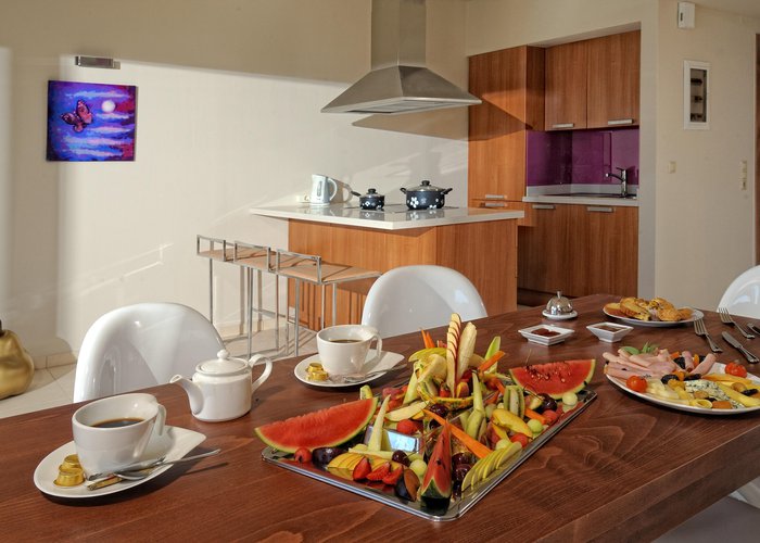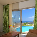 Air conditioning and individually adjustable heating ensure that rooms maintain comfortable temperatures. Guests can relax and enjoy the sea views from the balcony or private terrace of some rooms. The rooms have a double bed and a sofa bed. Extra beds can be requested. A safe, a minibar and a desk are also available. There is a fully-equipped kitchenette with a refrigerator, stovetop, tea/coffee station and oven. A trouser press is provided for guests' convenience. A direct dial telephone, a television with satellite/cable channels, an alarm clock and WiFi (no extra charge) are provided as well. Slippers are included. Bathrooms are equipped with a shower and a bathtub. A hairdryer, a vanity mirror and bathrobes are available for daily use. As a special feature, bathrooms are also stocked with cosmetic products and a selection of towels. Guests can also book wheelchair-friendly rooms with wheelchair-accessible bathrooms. The resort has family rooms, non-smoking rooms and smoking rooms.